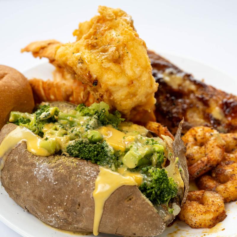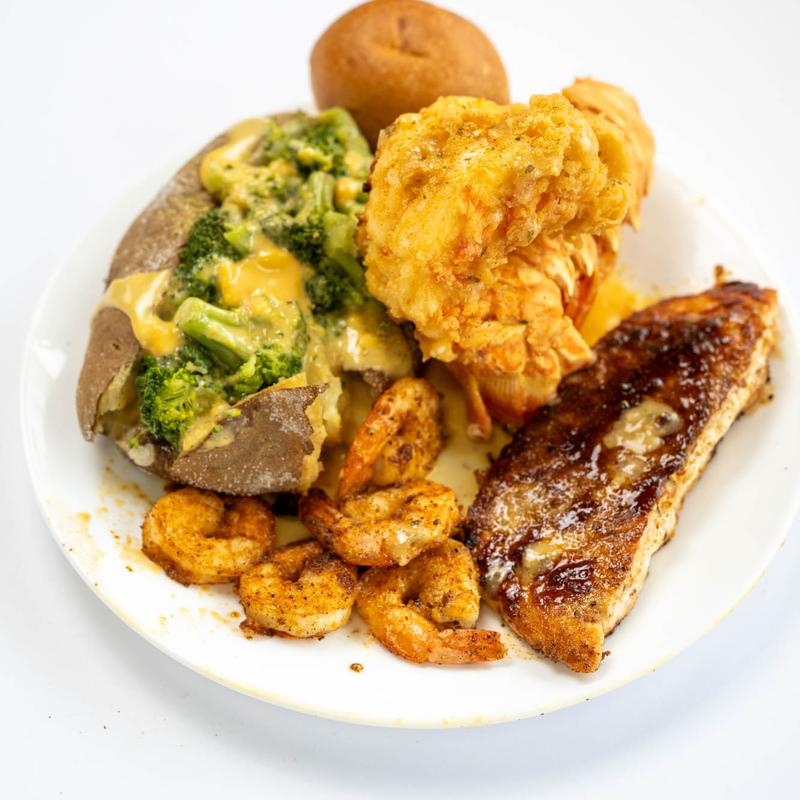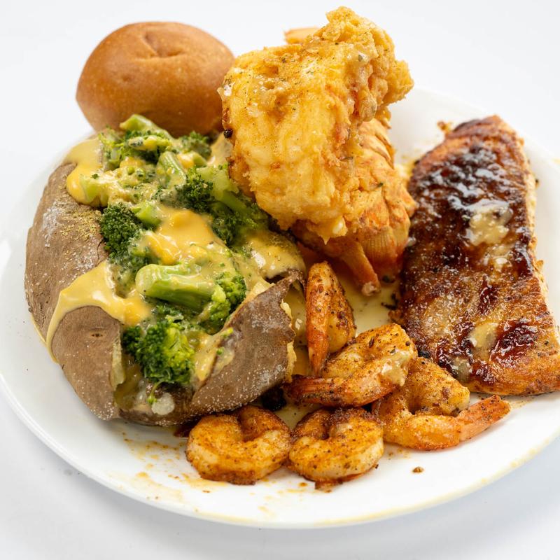 I got the seafood trio and it was amazing, potato was perfect, seafood was fresh, I added Italian sausage grilled onions and jalapenos. My fiance ordered the surf and turf and she ate it so fast I couldn't get a picture lol. Definitely coming back!